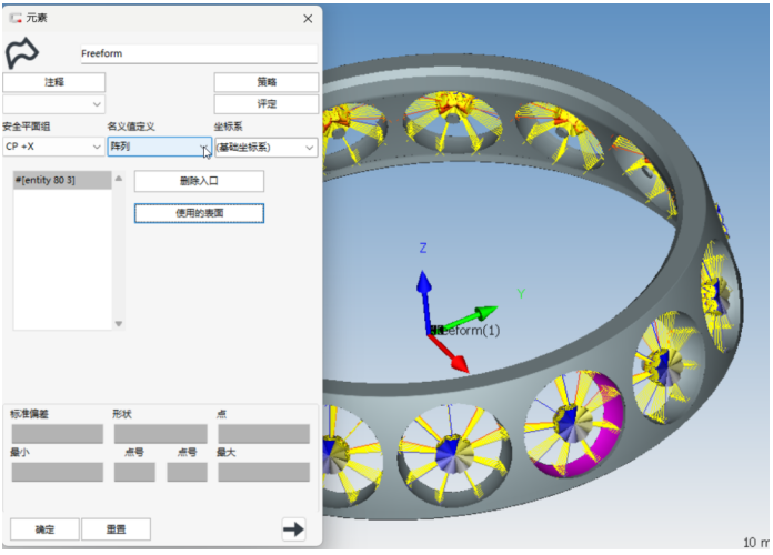 以前,曲面是无法阵列的,如果想测量阵列的曲面特征只能做辅助坐标系单独创建,或者使用曲线代替曲面,从CALYPSO 2024开始,可以应用自由曲面元素的阵列设置。能源行业的保持架有一个尺寸是兜孔的轮廓,这类尺寸要么不测,要么用曲线代替,现在可以直接用自由曲面做阵列测量。