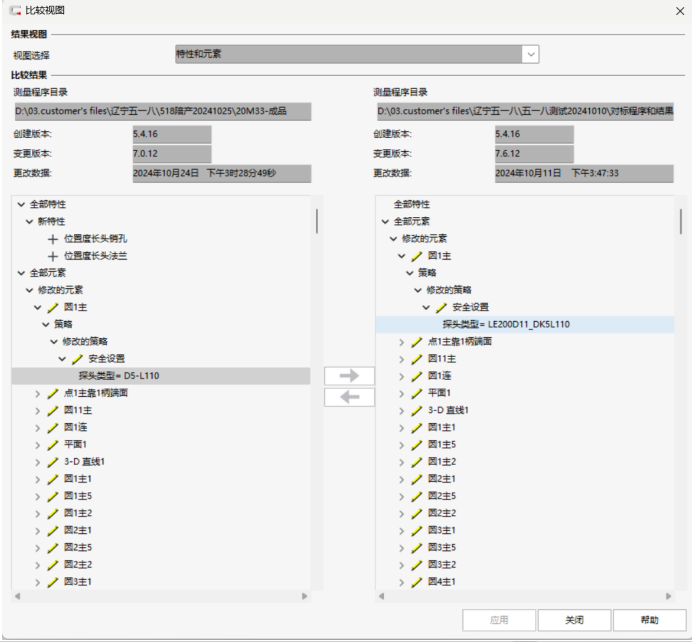 不少客户拥有不止一台蔡司三坐标,测量程序的管理是质量管理工作上非常重要的一环,为了统一程序中的参数设置,以前需要分别打开单独的程序然后记录更改项,或者将两台工作站放到一起,两边同时打开程序做比对,现在可以使用比较测量程序这个功能,在一个工作站中实现两个程序的比较,不但可以检查出程序中特性的数量还能将元素测量策略的差异标记出来。