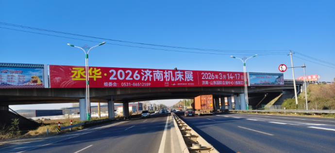 调研数据显示,潍坊地区专业观众占济南机床展全国观众总量的6%,且采购需求存在较大挖掘空间。基于此,展会在潍坊车流量日均3万余辆的核心路段布局跨桥广告,既借助高车流量实现展会大范围曝光,又精准锚定潍坊产业带流量枢纽,串联周边产业集群,让展会信息随车流传至产业链上下游,为展会吸纳更多精准采购商筑牢宣传根基。