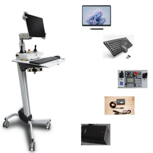 现在,蔡司无线移动小车助你摆脱束缚!它支持无线连接,搭配 13 英寸微软平板、独立无线键鼠和控制面板,彻底摆脱线缆困扰。高度能灵活调节,让你找到最舒服的操作姿势。