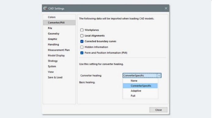 全新的修复转换器对话框,让您能够自定义导入CAD文件时应用的优化程度。转换器可以填补数据空白、修复现有的PMI信息,并提供从基础校正到完整模型恢复的多种修复模式。
