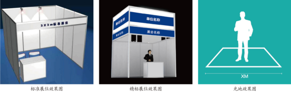 2. 精标展位基本配置:3m×3m展位(包括精装标准展台、布幅广告门楣、地毯、一桌两椅、门楣射灯、展位射灯、220V电源插座);