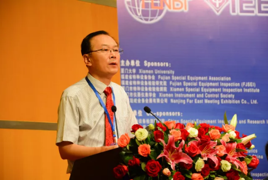在主席台就坐的领导嘉宾有中国特种设备检测研究院林树青院长、国家市场监管总局特种设备安全监察局高继轩副局长、美国斯坦福大学Fu-Kuo Chang教授、中国工程院陈学东院士、美国密苏里大学Reza Zoughi教授、中国特种设备检测研究院寿比南研究员、厦门大学卿新林教授、远东无损检测新技术论坛理事会主席强天鹏研究员、福建省特种设备检验协会孙贞坚秘书长、中国无损检测学会徐永昌秘书长、中国特种设备检验协会沈钢秘书长、北京理工大学徐春广教授、美国ASNT国际委员会主席Marwan Basrawi先生、波兰无损检测学会理事长Tomasz Chady先生、韩国无损检测学会副主席、2020世界无损检测大会主席赵允浩先生、日本无损检测学会西野秀朗教授、厦门市特种设备检测研究院黄学斌院长、厦门市仪器仪表学会洪永强主席。