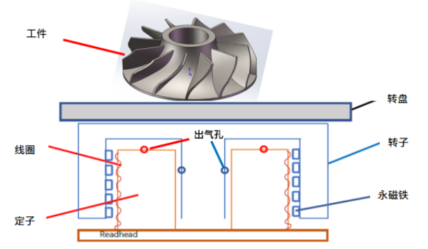 线圈:通电后产生磁场,与永磁铁磁场相斥,以保证旋转时定子和转子无干涉