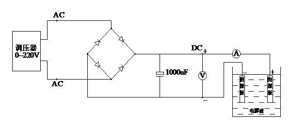 电解抛光对试样预磨要求低,速度快,但电解抛光也存在电解液成分多样复杂,对具体材料要掌握可行的操作规范有一定的难度,为了充分发挥电解抛光在金相制样中的优点,我们利用现有的仪器制作了简易电解抛光装置,所选仪器如下:(1)调压变压器3K (2)整流器 (3)1000mL烧杯 (4)2.5A电源线 (5)直流电压表(100V/0.5级) (6)直流电流表(0-25A/0.5级)等,接线见图1。