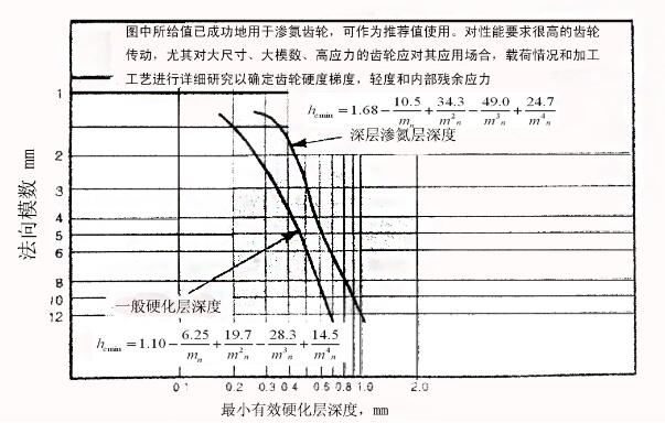 从图1 ISO和图2 AGMA标准的渗氮齿轮硬化层深度推荐图可以看出有一个相同的共同点,即齿轮的模数都限于12(mm)以下,图1 IS0齿轮渗氮层深度推荐值图中m=12(mm)的最大渗氮层深度约0.7(mm)。图2 AGMA齿轮渗氮层深度推荐值图中m=12(mm)对应的最大渗氮层深度约1.0(mm)。