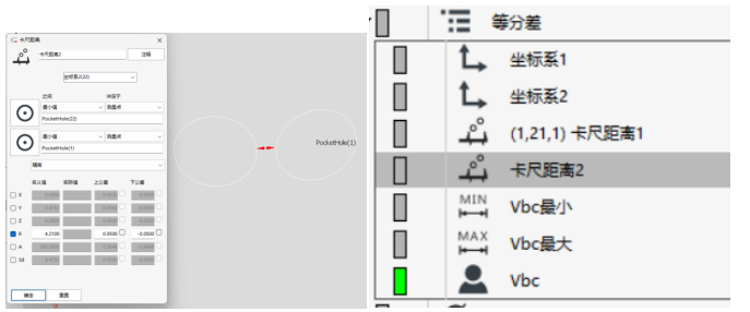 2016以前的版本只能给出圆心之间的距离,想要求边缘的最大最小距离需要通过其他方式,保持架有一个尺寸叫做等分差,求每相邻两个兜孔之间的最大与最小距离,以前我们只能通过构造名义极值点,然后输出两点距离的方式测量这个尺寸,现在可以直接用卡尺距离功能,实现起来简单且直接。